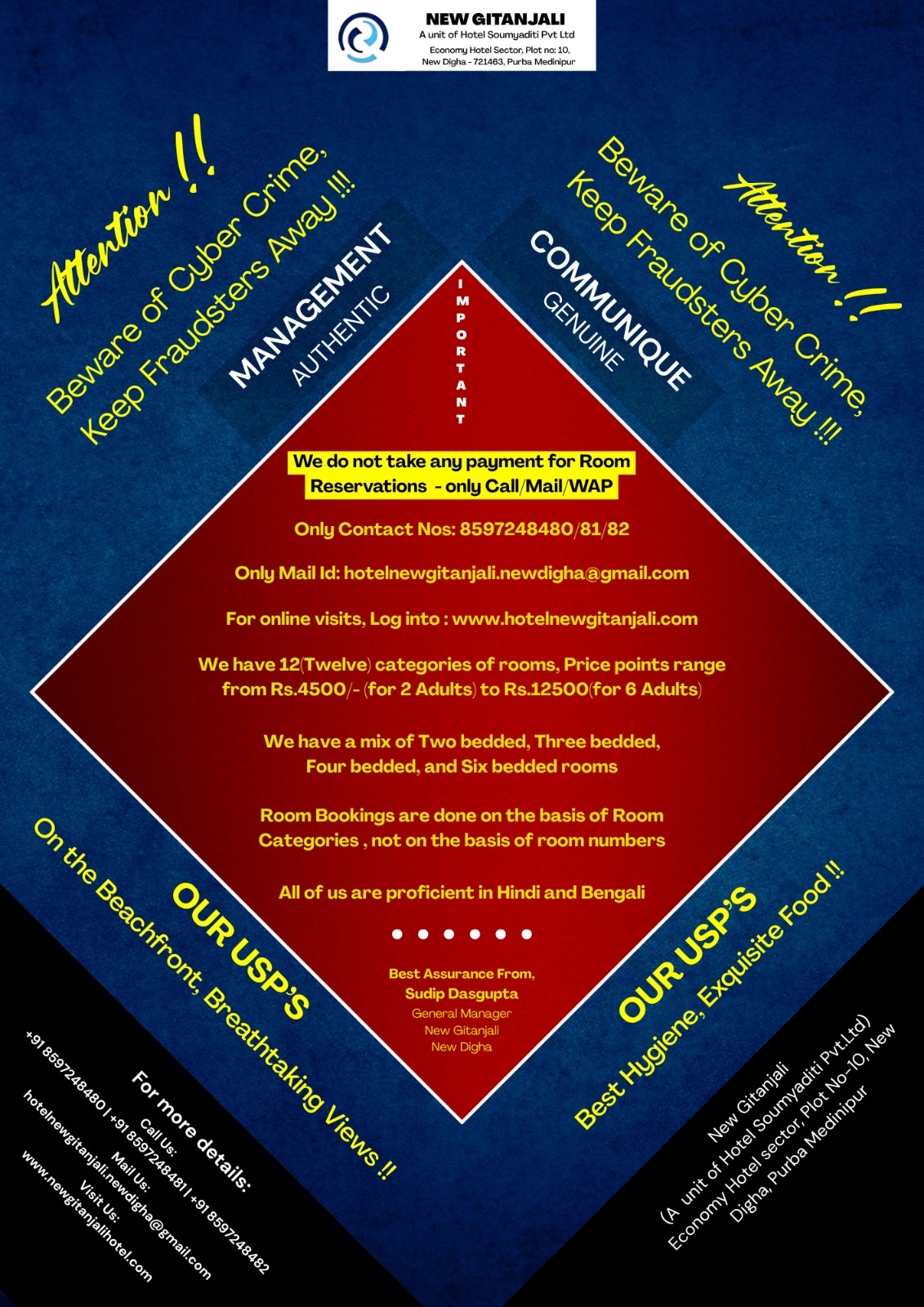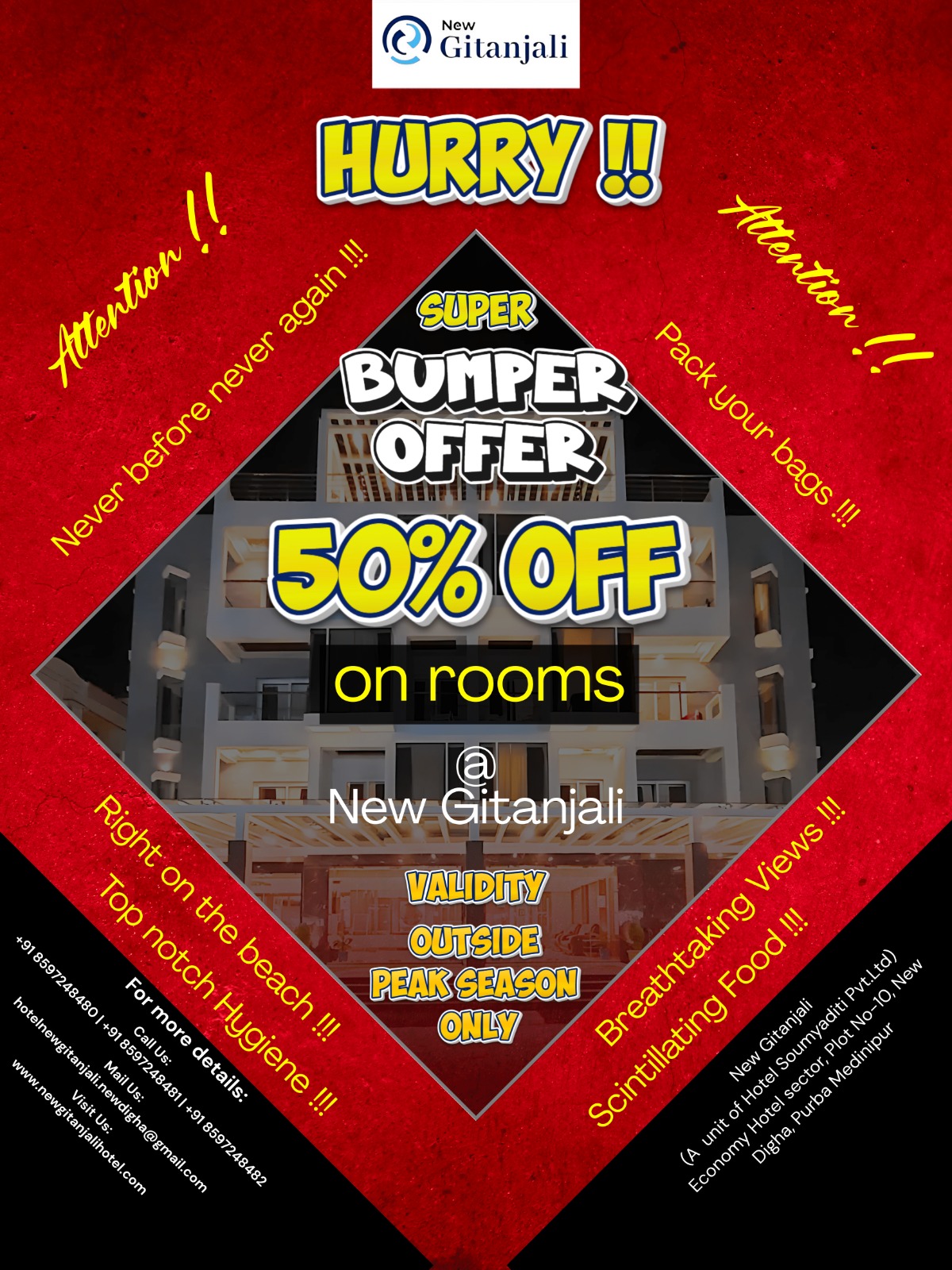 Experience unmatched comfort and elegance at Hotel New Gitanjali, the best hotel in New Digha located just steps from the New Digha sea beach. Our beautifully designed sea-facing rooms offer breathtaking views, ensuring a serene and luxurious stay. Indulge in delectable cuisine at our in-house restaurant, relax in our aesthetic interiors, and enjoy 24/7 room service along with modern amenities for a seamless experience. Whether for a peaceful retreat or a lavish getaway, this New Digha hotel near sea beach promises the perfect blend of comfort, convenience, and luxury.